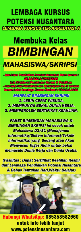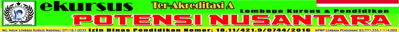 E-KURSUS LKP POTENSI NUSANTARA SISTEM PEMBELAJARAN ONLINE LEMBAGA PENDIDIKAN POTENSI NUSANTARA Copyright © 2016-2020 Developed by Zulkarnain Lbs Jl. Kamboja Perbaungan Kab. Serdang Bedagai, Propinsi Sumatera Utara www.potensinusantara.com Izin Depdiknas Nomor: 18.11/421.9/0744/2016 - Izin Direktorat Pembinaan Kursus & Pelatihan Kemendikbud R.I Nomor: 07118.1.0035 - NPWP Lembaga Pendidikan: 83.771.355.1-114.000 - Akta Notaris Lembaga Potensi Nusantara Nomor: 01/AKTA-04-10/043/2016 - Ter-Akreditasi A |